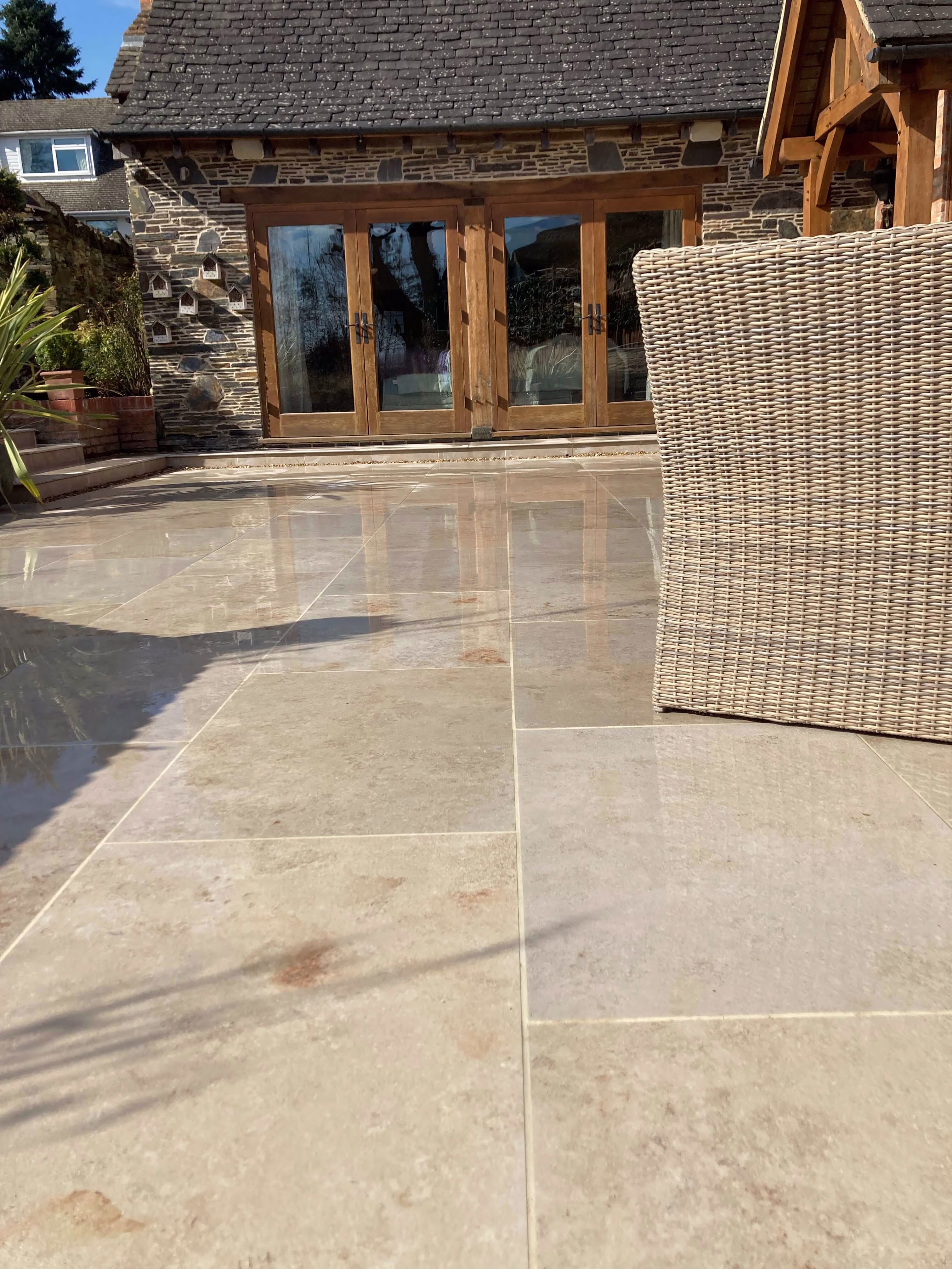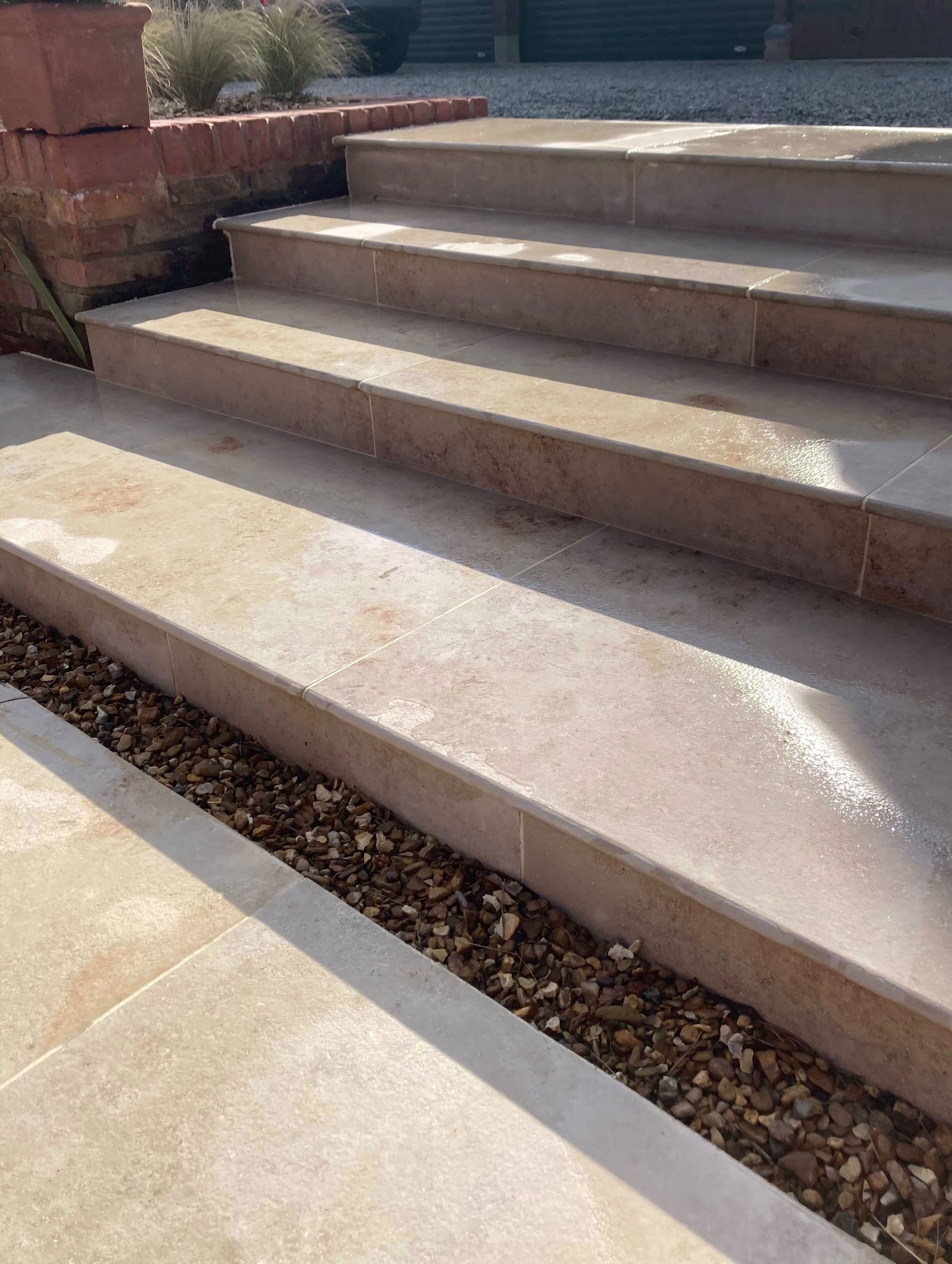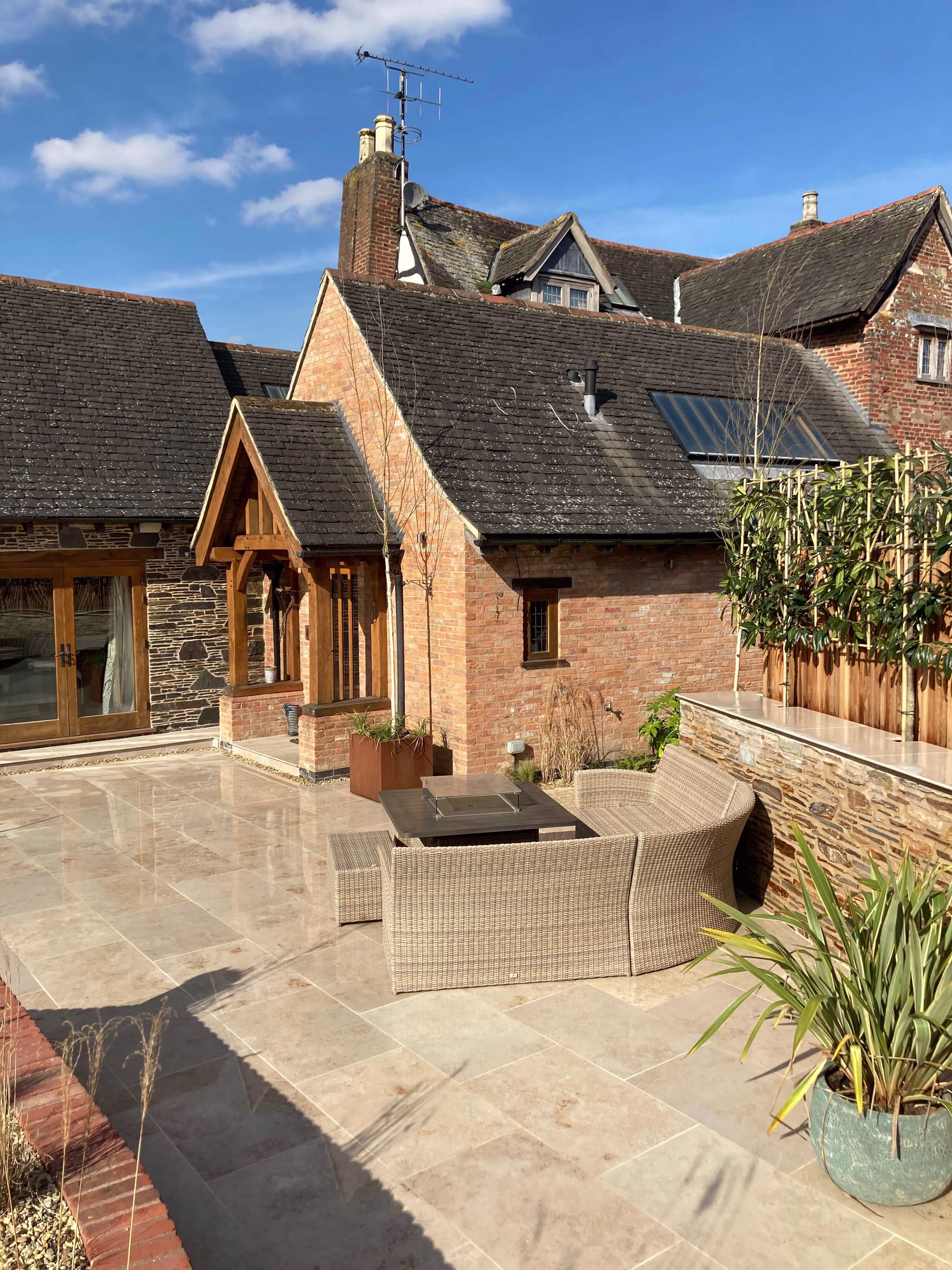 Our clients wanted a design that would feel fresh and practical, but still in keeping with the property’s character. Using porcelain paving for the main patio introduced a sleek, durable surface, while the flowing path of hand-laid limestone setts added a handcrafted, traditional touch.